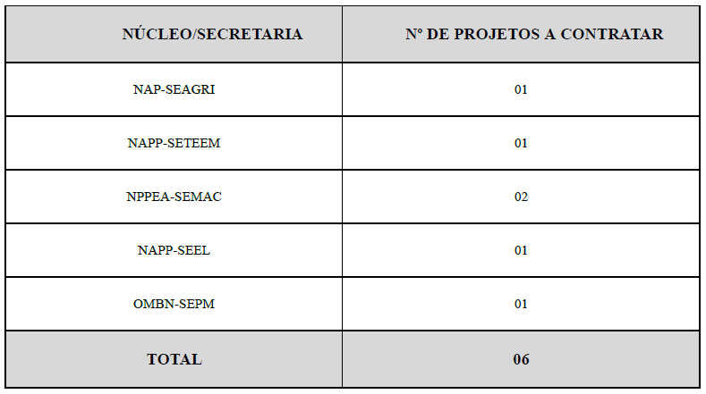 b) O quantitativo de quotas de projetos a contratar por Núcleo/Secretaria será detalhado no quadro abaixo: