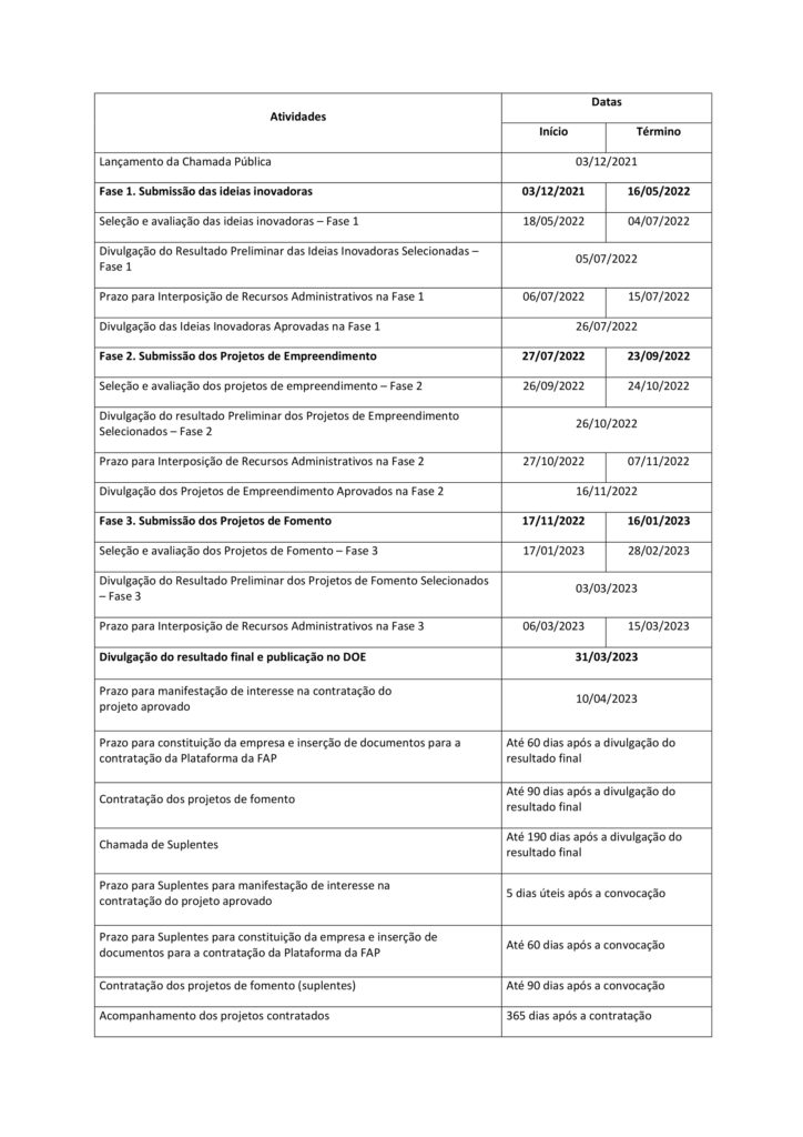 As datas são passíveis de alteração de acordo com o andamento das atividades e as novas versões do cronograma serão publicadas no site da FAPITEC/SE e Programa Centelha.